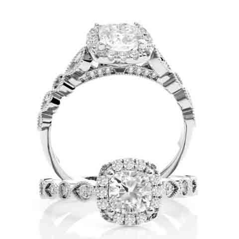 This fabulous moissanite engagement ring features a sparkling 1 carat cushion cut center moissanite in E-F color, VVS1-VVS2 clarity. It is surrounded by 42 side moissanites totaling 1/3 carat. Total carat weight is 1 1/3 carats. This ring is in 14 karat white gold.