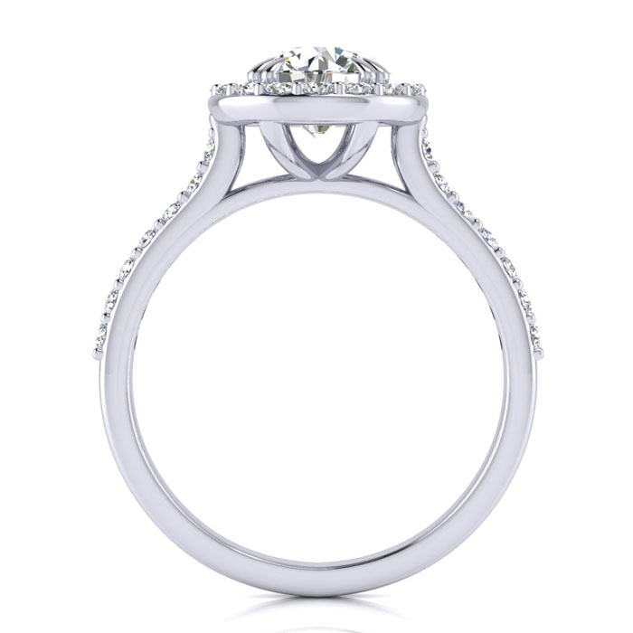 This elegant moissanite engagement ring features a sparkling 1 carat center moissanite in E-F color, VVS1-VVS2 clarity. It is surrounded by 30 side moissanites in a halo totaling 1/4 carat. Total carat weight is 1 1/4 carat. This ring is in 14 karat white gold.
