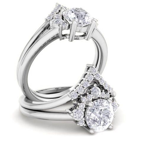 This matching V wedding band features 9 moissanites in E-F color, VVS1-VVS2 clarity. Total carat weight is approximately 1/10 carat. This ring is in 14 karat white gold.