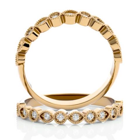 This fabulous moissanite wedding band features 11 sparkling moissanites in E-F color, VVS1-VVS2 clarity totaling approximately 1/10 carat. This ring is in 14 karat yellow gold.