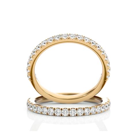 This fabulous moissanite wedding band features 20 sparkling moissanites in E-F color, VVS1-VVS2 clarity totaling approximately 1/2 carat. This ring is in 14 karat yellow gold.