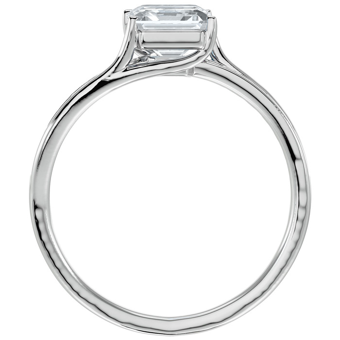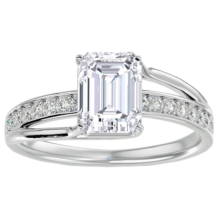 This moissanite ring features one 8x6mm emerald shape moissanite gemstone in E-F color, VVS1-VVS2 clarity. It is surrounded by 14 sparkling diamonds totaling 1/5 carat in I-J color, I1-I2 clarity. Total carat weight is approximately 1 3/4 carats. This ring is in sterling silver.