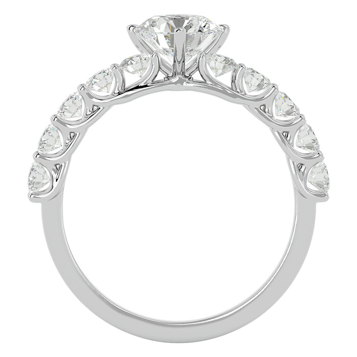 This fabulous moissanite engagement ring features a sparkling 1 carat round shape center moissanite in E-F color, VVS1-VVS2 clarity. It is surrounded by 10 side moissanites totaling 3/4 carat. Total carat weight is 1 3/4 carats. This ring is in 14 karat white gold.