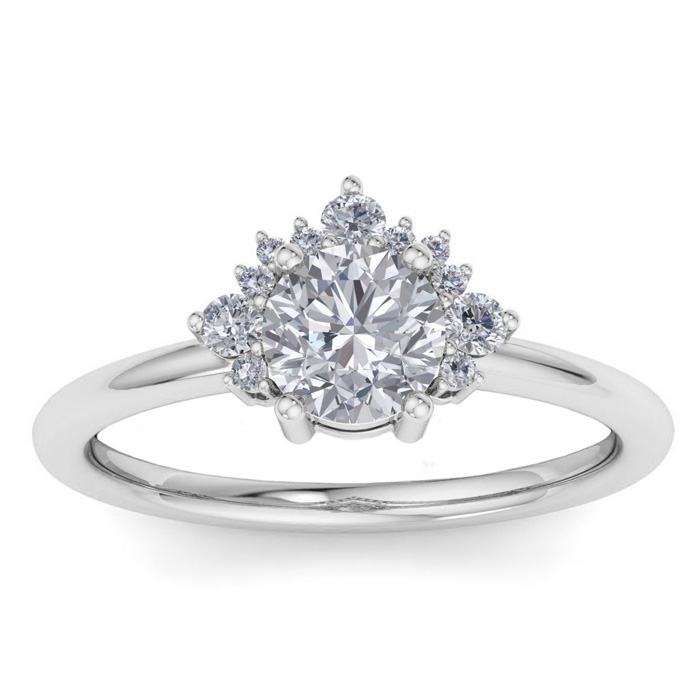 This unique engagement ring features a 0.80 carat center moissanite. It is accented with a crown of 11 moissanites in E-F color, VVS1-VVS2 clarity. Total carat weight is approximately 1 carat. This ring is in 14 karat white gold.