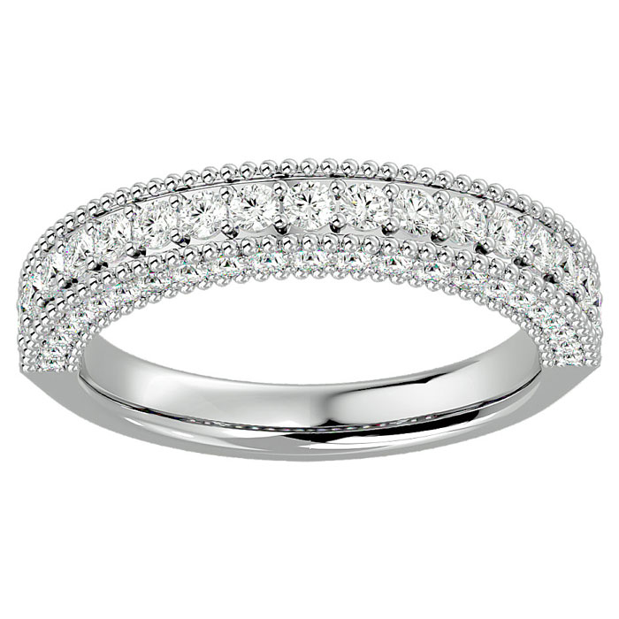 This fabulous moissanite wedding band features 52 sparkling moissanites in E-F color, VVS1-VVS2 clarity totaling approximately 1 carat. This ring is in 14 karat white gold.