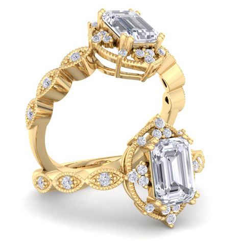 This unique engagement ring features a 3/4 carat octagon shape center moissanite. It is accented with 22 moissanites in E-F color, VVS1-VVS2 clarity. Total carat weight is approximately 1 carat. This ring is in 14 karat yellow gold.
