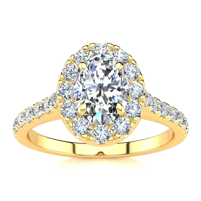 1 Carat Oval Shape Halo Moissanite Engagement Ring in 14 Karat Yellow Gold