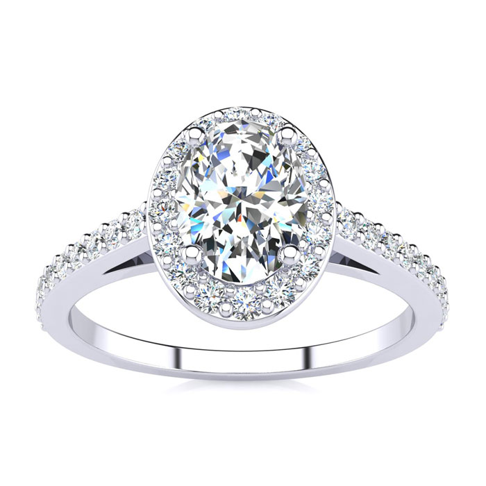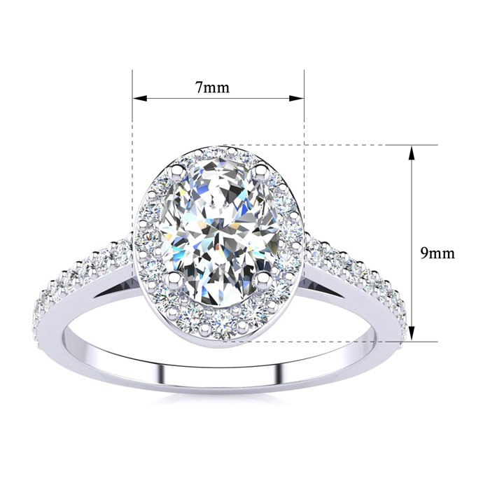 This moissanite ring features one 7x5mm oval shape moissanite gemstone in E-F color, VVS1-VVS2 clarity. It is surrounded by 38 sparkling diamonds totaling 1/3 carat in I-J color, I1-I2 clarity. Total carat weight is approximately 1 carat. This ring is in sterling silver.