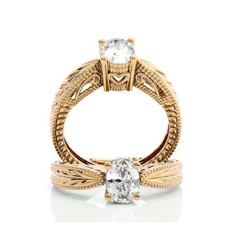 1 Carat Oval Shape Moissanite Solitaire Engagement Ring with Tapered Etched Band In 14 Karat Yellow Gold