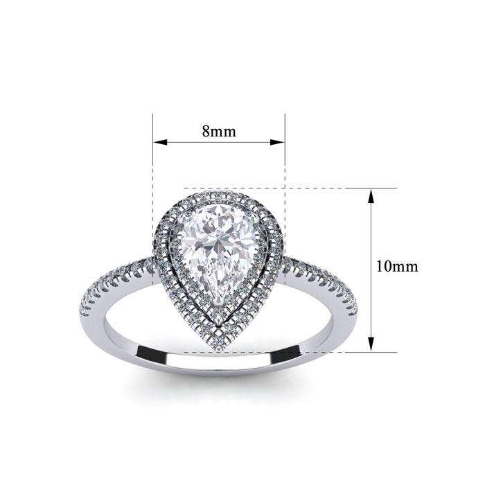 This moissanite ring features one 7x5mm pear shape moissanite gemstone in E-F color, VVS1-VVS2 clarity. It is surrounded by 62 sparkling diamonds totaling 1/3 carat in I-J color, I1-I2 clarity. Total carat weight is approximately 1 carat. This ring is in sterling silver.