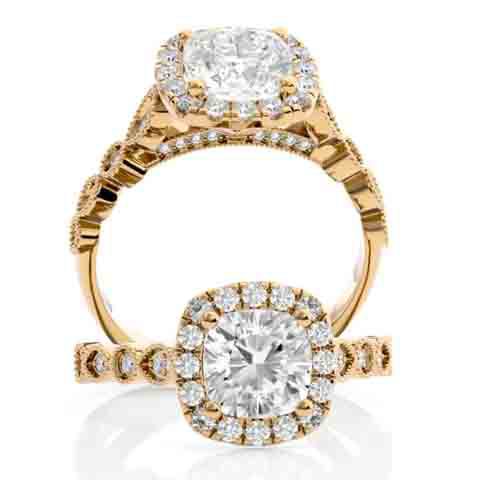 This fabulous moissanite engagement ring features a sparkling 2 carat cushion cut center moissanite in E-F color, VVS1-VVS2 clarity. It is surrounded by 42 side moissanites totaling 1/2 carat. Total carat weight is 2 1/2 carats. This ring is in 14 karat yellow gold.