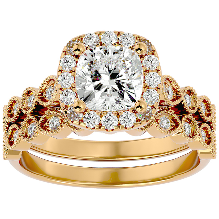 2 Carat Cushion Cut Moissanite Bridal Set In 14 Karat Yellow Gold