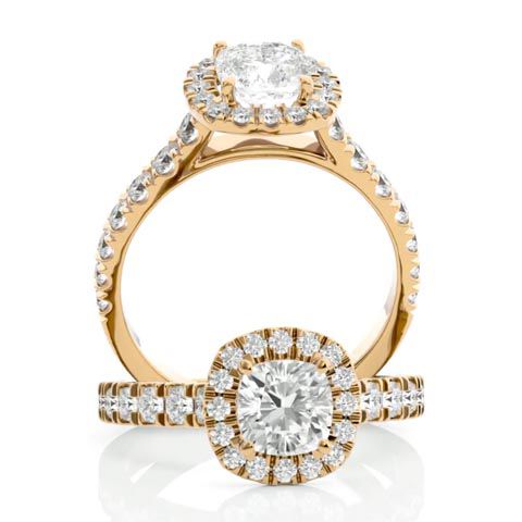 2 Carat Cushion Cut Moissanite Halo Engagement Ring In 14 Karat Yellow Gold