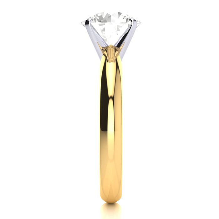 The yellow gold is band part of the ring has a beautiful shine to it. It's thinner than I had anticipated it be and the reason for the 4 stars and not 5. The stone is very attractive, shimmering and shinning in all directions of movement. The four prongs that hold the moissanite in place are if a white sterling silver or white gold, same as the setting. Now that I've received it, I do wish I would have went with a 6 prong instead because I am hard on my jewelry and I'm afraid of me being careless and damaging. However, my solution is to find a solitaire enhancer, ring wrap guard wedding band to help protect the stone better.