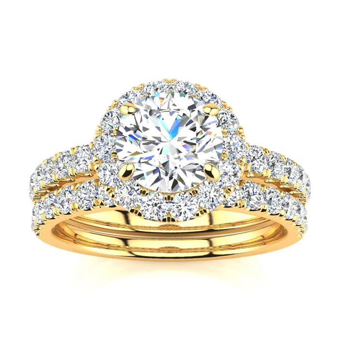 2 Carat Round Moissanite Halo Bridal Set In 14 Karat Yellow Gold