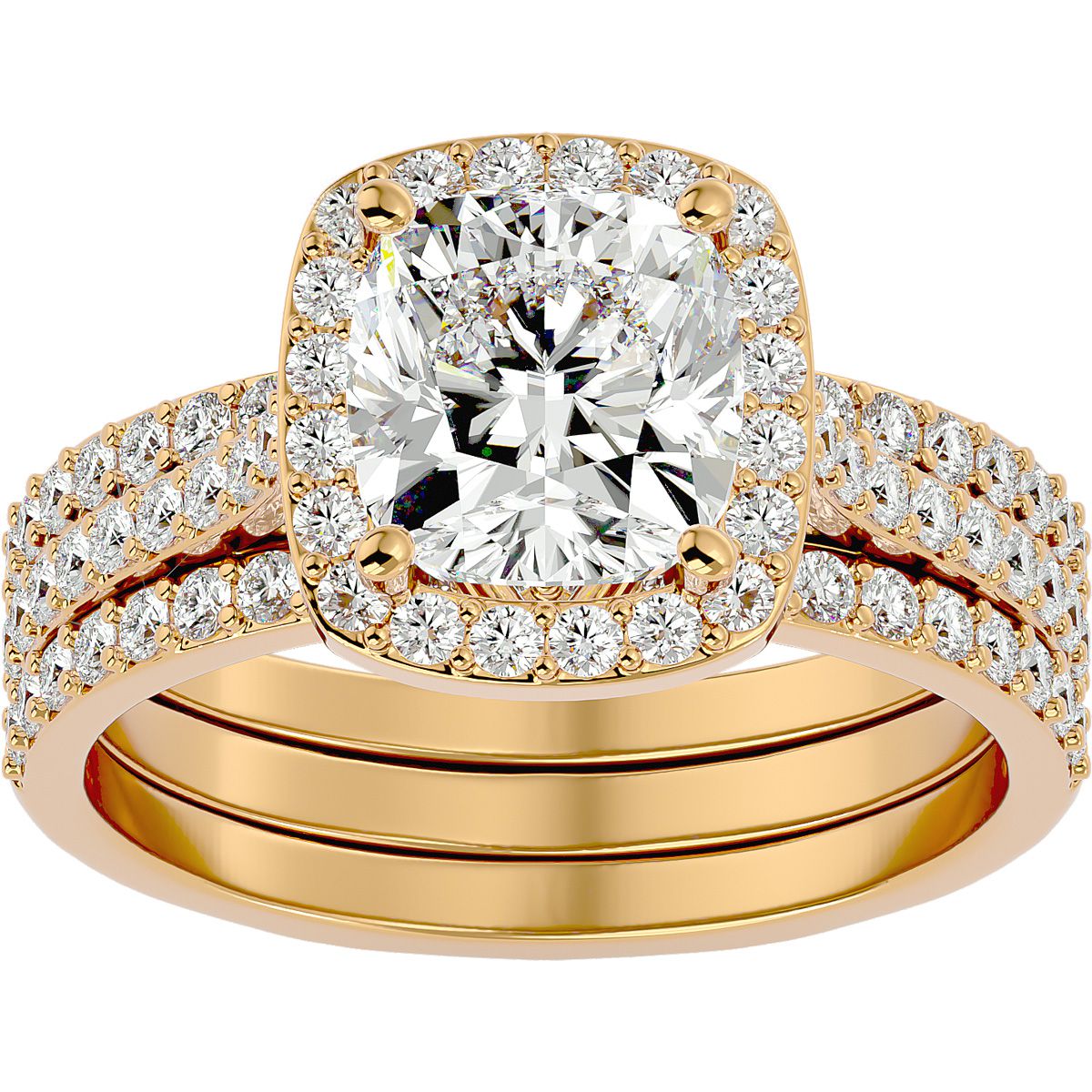 3 1/4 Carat Cushion Cut Halo Moissanite Bridal Set In 14 Karat Yellow Gold