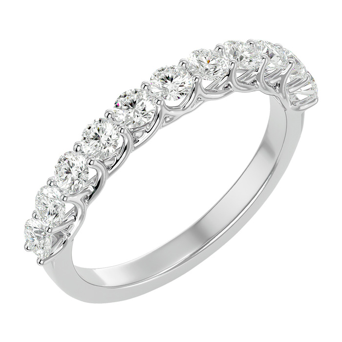 This fabulous moissanite wedding band features 11 sparkling moissanites in E-F color, VVS1-VVS2 clarity totaling approximately 3/4 carat. This ring is in 14 karat white gold.