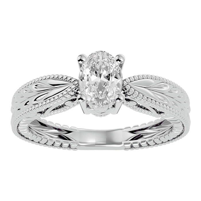3/4 Carat Oval Shape Moissanite Solitaire Engagement Ring with Tapered Etched Band In 14 Karat White Gold