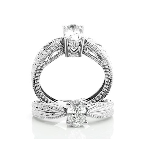3/4 Carat Oval Shape Moissanite Solitaire Engagement Ring with Tapered Etched Band In 14 Karat White Gold
