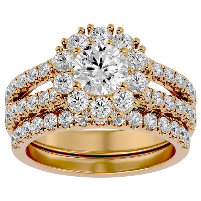 This fabulous moissanite bridal set features a sparkling 2 carat round shape center moissanite in E-F color, VVS1-VVS2 clarity. It is surrounded by a halo of 52 side moissanites between the ring and band totaling 2 1/2 carats. Total carat weight is 4 1/2 carats. This ring is in 14 karat yellow gold.