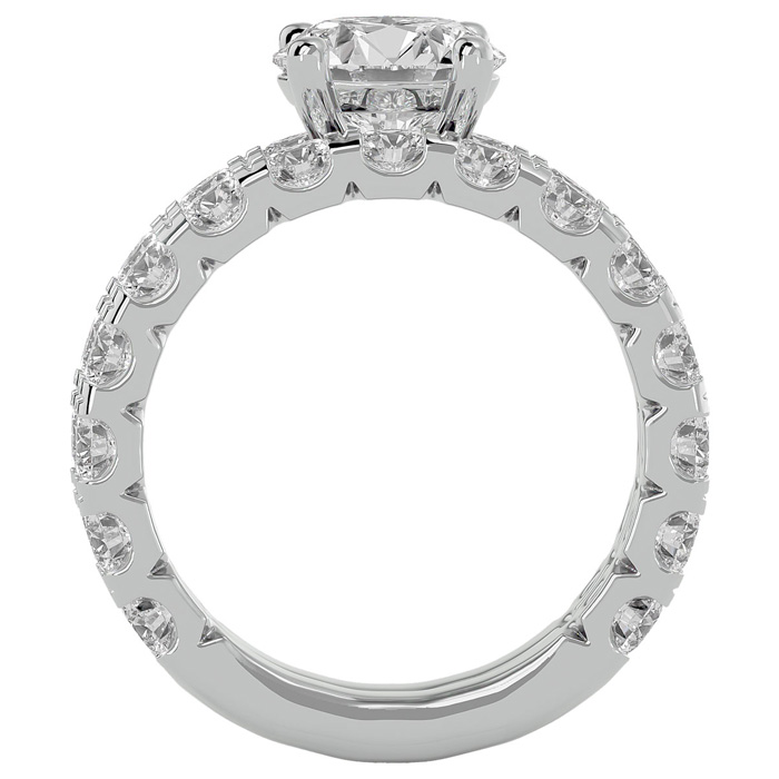 This elegant moissanite bridal set features a sparkling 2 carat center moissanite in E-F color, VVS1-VVS2 clarity. It is surrounded by 29 sparkling moissanites totaling 3 carats. Total carat weight is approximately 5 carats. This ring is in 14 karat white gold.