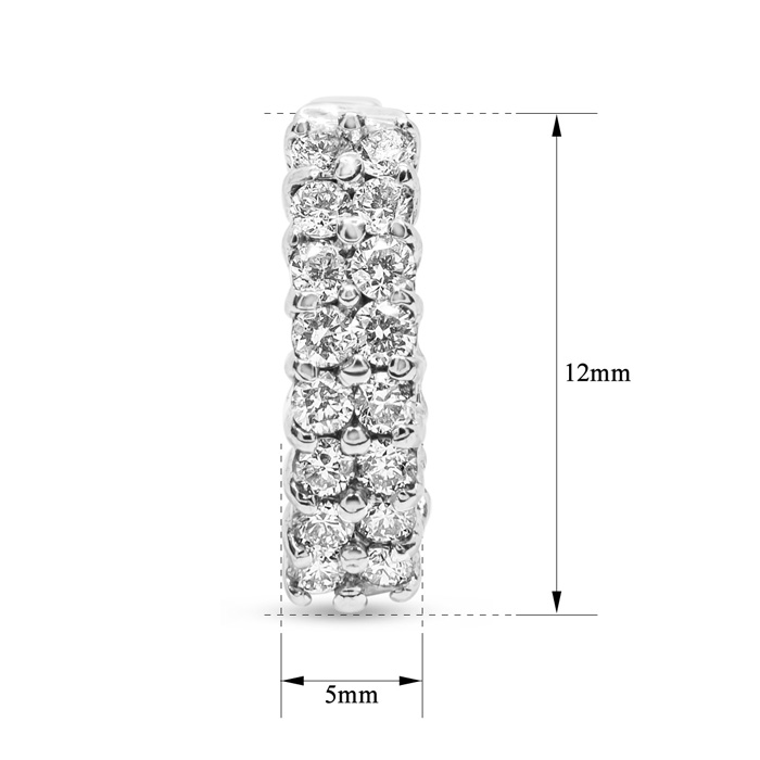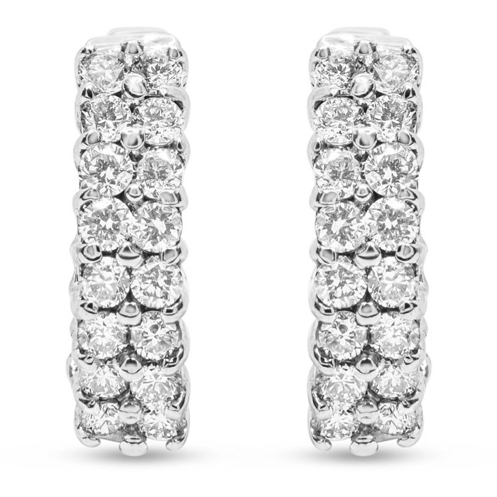 These classic moissanite huggie hoop earrings feature 32 sparkling moissanites in E-F color, VVS1-VVS2 clarity. Total carat weight is approximately 1/2 carat. These earrings have secure hidden snap backs and dangle down 1/2 inch. Earrings are in 14 karat white gold and are 5mm wide.