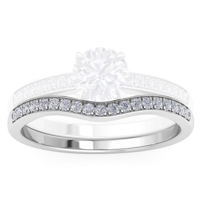 This amazing matching moissanite band features 19 round moissanites in E-F color, VVS1-VVS2 clarity. Total carat weight is approximately 1/5 carat. This ring is in 14 karat white gold.