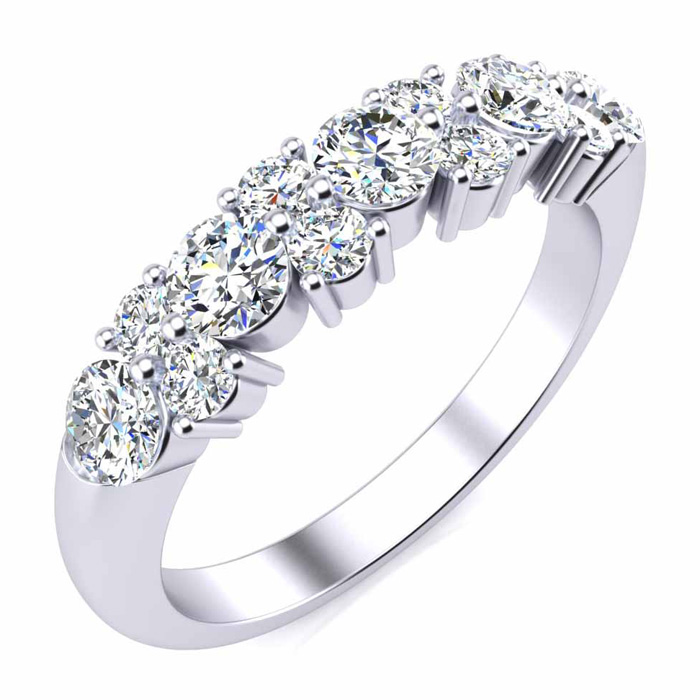 This ring features 13 moissanites arranged like garland. Total carat weight is 3/4 carat and moissanites are in E-F color, VVS1-VVS2 clarity. This ring is 4mm wide. This ring is in 14 karat white gold.