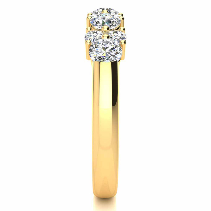 This ring features 13 moissanites arranged like garland. Total carat weight is 3/4 carat and moissanites are in E-F color, VVS1-VVS2 clarity. This ring is 4mm wide. This ring is in 14 karat yellow gold.