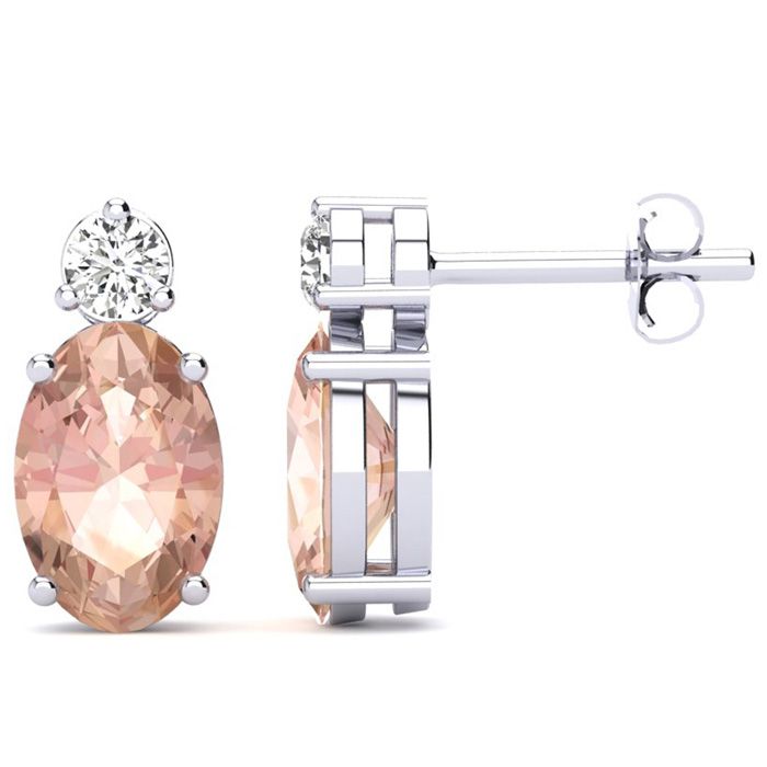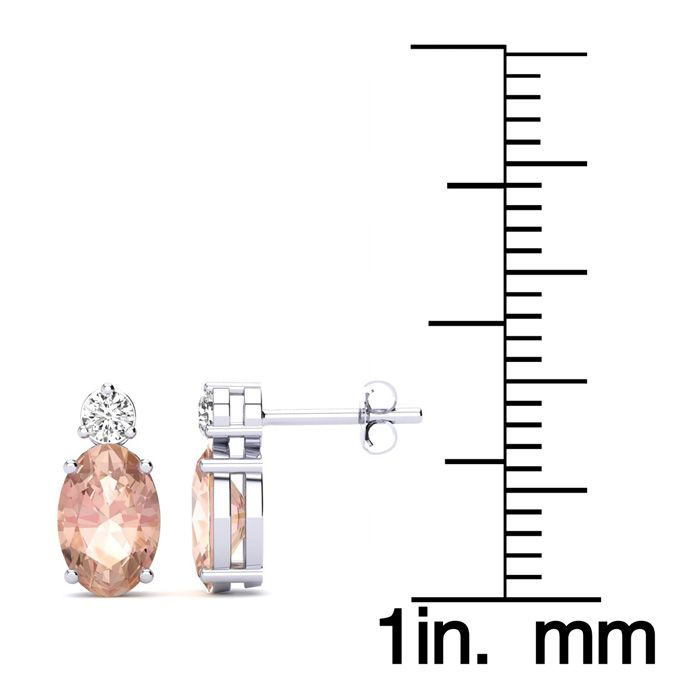 These morganite earrings feature two 7x5mm oval shape morganite gemstones at 1-2/3 carats. The gemstones are accented with two sparkling diamonds in a in I-J color, SI2-I1 clarity at 1/16 carats. Total gem weight is 1-2/3 carats. These earrings are crafted in 14 karat white gold and come with comfortable and secure post with friction backs.