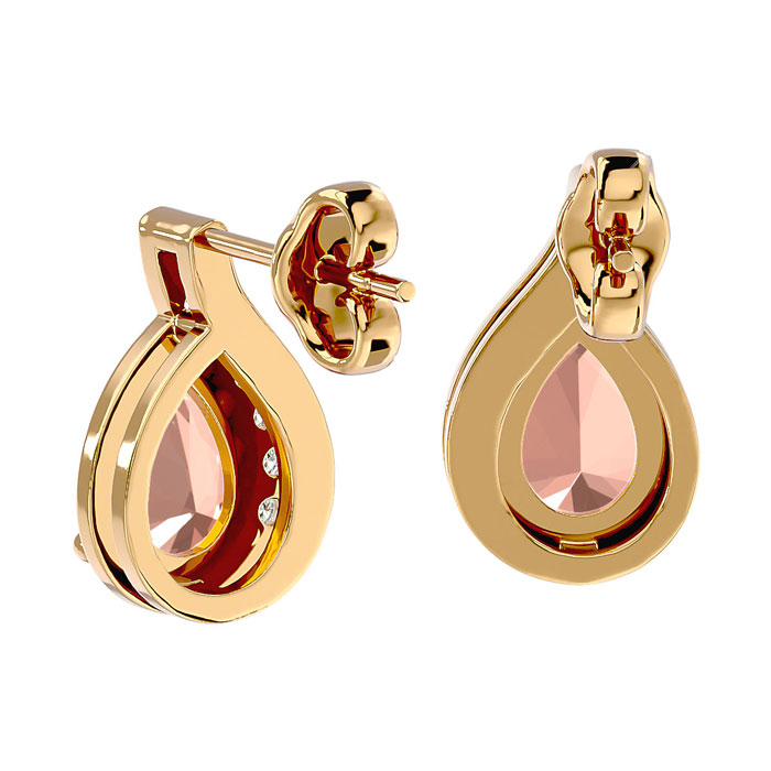 These morganite earrings feature two 7x5mm pear shape morganite gemstones at approximately 1-1/3 carats. They are surrounded by 12 sparkling diamonds in I-J color, I1-I2 clarity at 1/10 carat total weight. Total gem weight is approximately 1-2/5 carats. These earrings are in 14 karat yellow gold and have comfortable and secure friction backs.