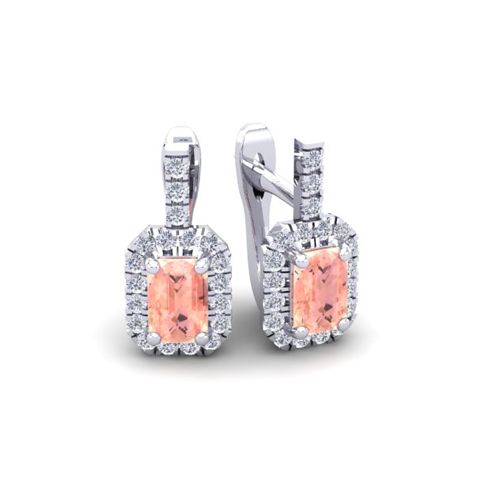 These morganite earrings feature two 6x4mm octagon cut morganite gemstones at 1-1/5 carats. The gemstones are surrounded by 38 sparkling diamonds in a halo in I-J color, SI2-I1 clarity at 1/2 carats. Total gem weight is 1-3/4 carats. These earrings are crafted in 14 karat white gold and come with comfortable and secure snap backs.