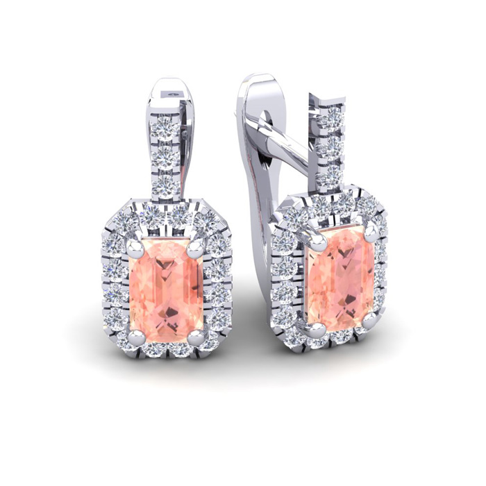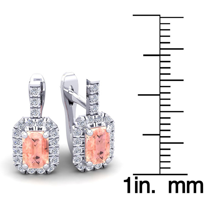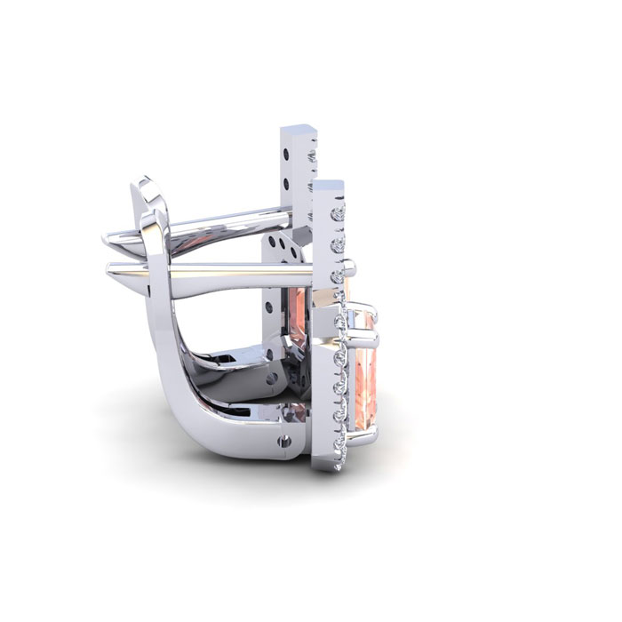 These morganite earrings feature two 6x4mm octagon cut morganite gemstones at 1-1/5 carats. The gemstones are surrounded by 38 sparkling diamonds in a halo in I-J color, SI2-I1 clarity at 1/2 carats. Total gem weight is 1-3/4 carats. These earrings are crafted in 14 karat white gold and come with comfortable and secure snap backs.