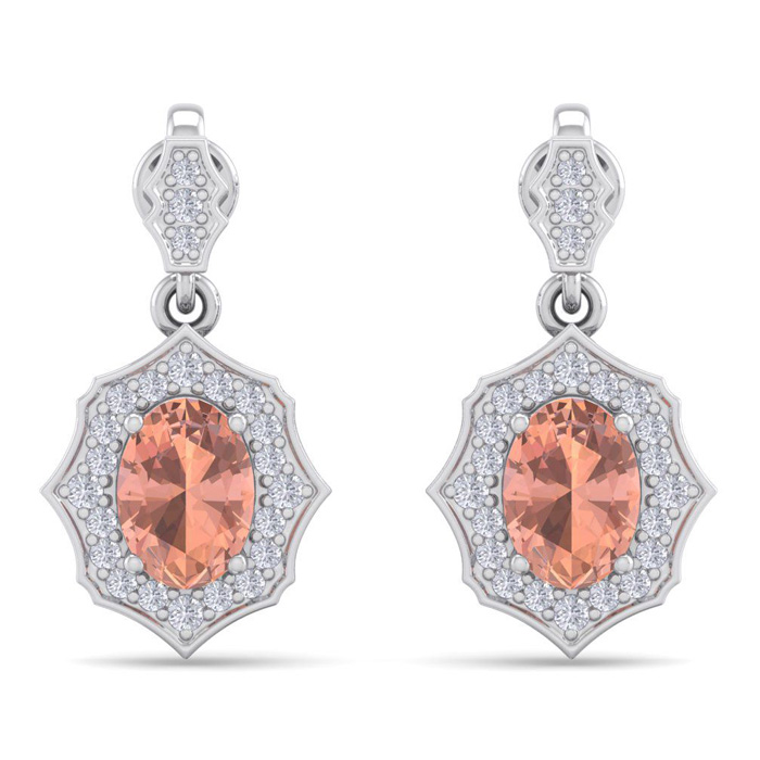 Retrograde Birthstones™ 1-3/4 Carat Oval Shape Morganite Earrings and Diamond Halo Dangles In 14 Karat White Gold
