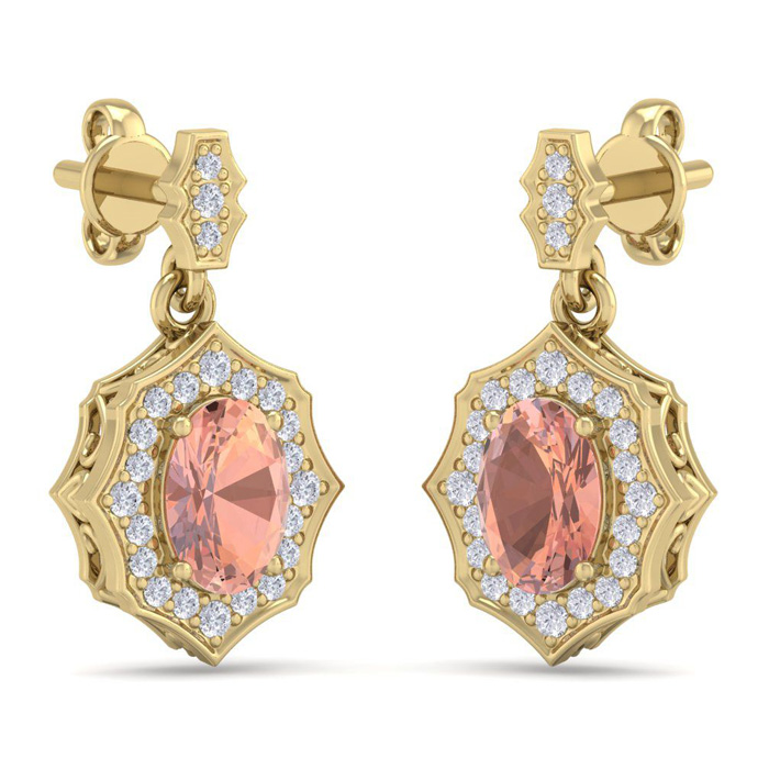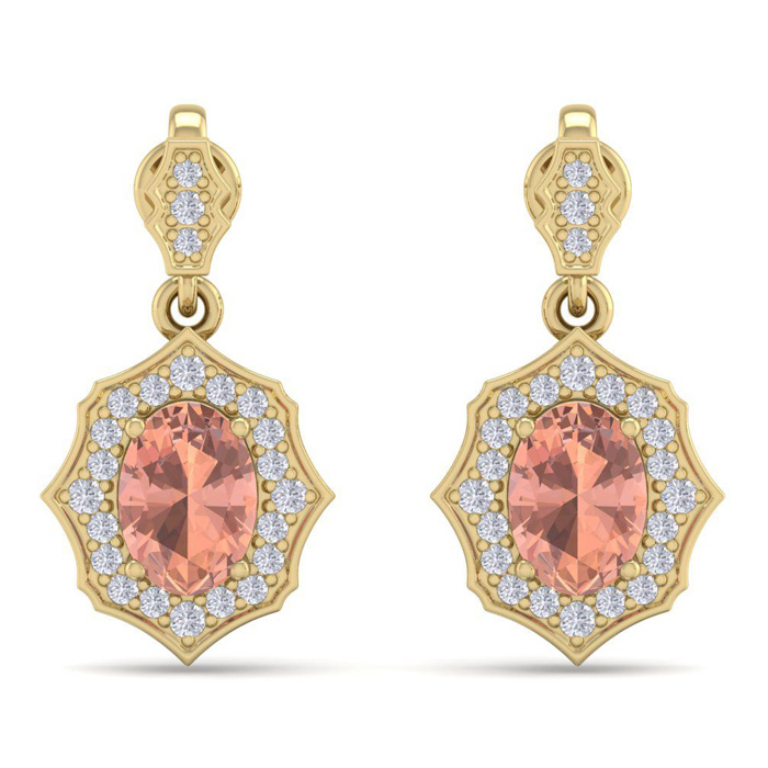 1-3/4 Carat Oval Shape Morganite Earrings and Diamond Halo Dangles In 14 Karat Yellow Gold