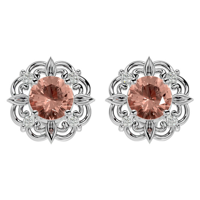 1-3/4 Carat Round Shape Morganite Earrings with Diamond Antique Design Studs In 14 Karat White Gold