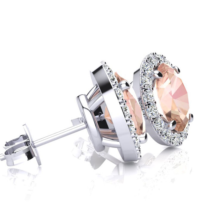 These morganite earrings feature two 6x4mm oval shape morganite gemstones at 9/10 carats. They are surrounded by 44 sparkling diamonds in I-J color, I1-I2 clarity at 1/8 carats. Total gem weight is 1 carats. These earrings are crafted in 14 karat white gold and have comfortable and secure post with friction backs.