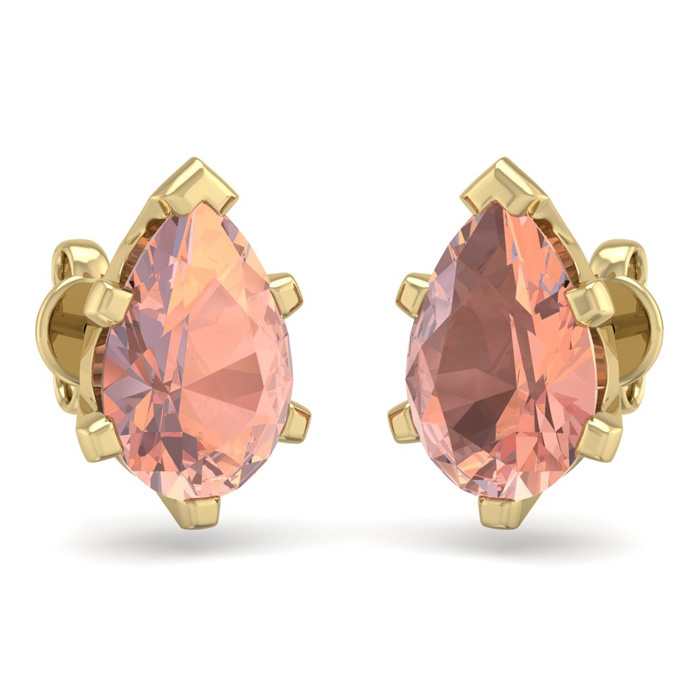 These morganite earrings feature two 9x6mm pear shape morganite gemstones. Each stone weighs approximately 1-1/6 carats, for a total carat weight of approximately 2-1/3 carats. These earrings are in 14 karat yellow gold over sterling silver and have comfortable and secure post with friction backs.
