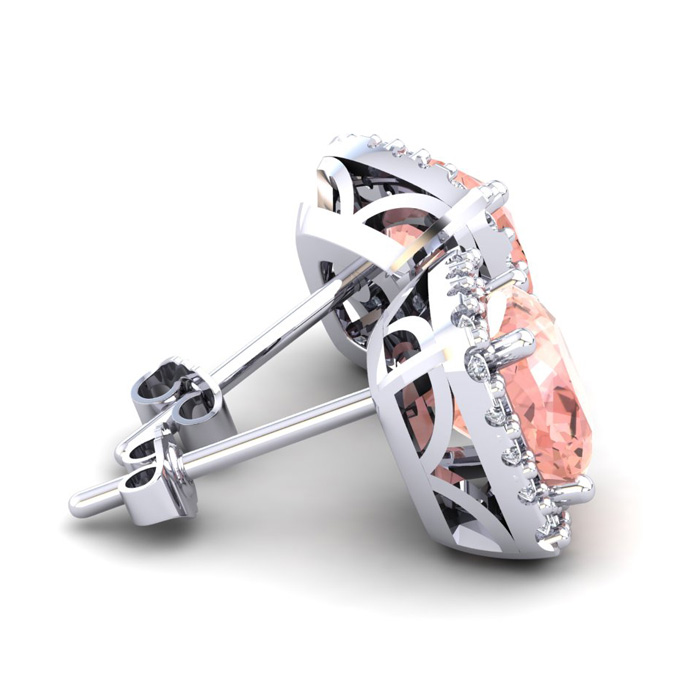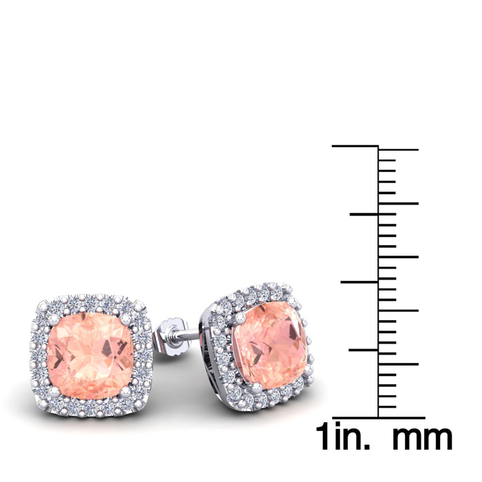 These morganite earrings feature two 8x8mm cushion cut morganite gemstones at 6-1/5 carats. The gemstones are surrounded by 40 sparkling diamonds in a halo in I-J color, SI2-I1 clarity at 1/2 carats. Total gem weight is 6-3/4 carats. These earrings are crafted in 14 karat white gold and come with comfortable and secure post with friction backs.