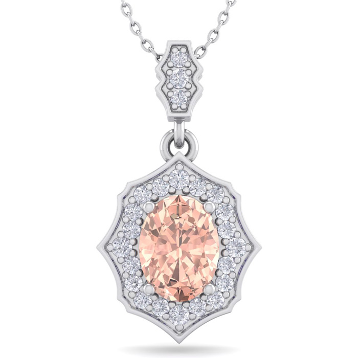 1-1/2 Carat Oval Shape Morganite Necklace With Fancy Diamond Halo In 14 Karat White Gold With18 Inch Chain