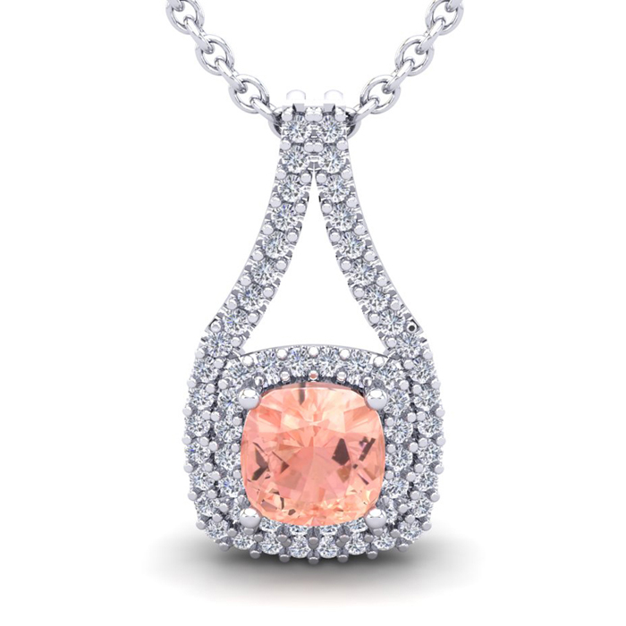 1-1/4 Carat Cushion Shape Morganite Necklace and Double Diamond Halo In 14 Karat White Gold With 18 Inch Chain