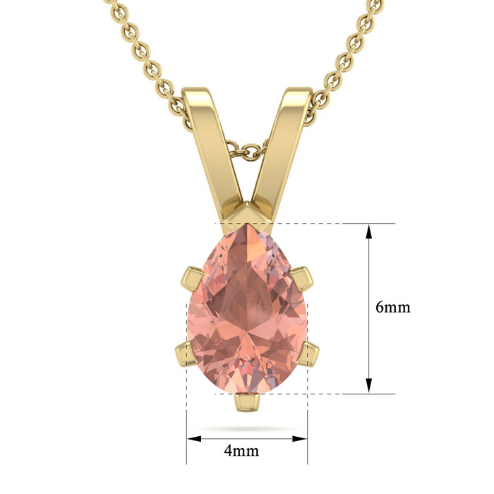 This morganite necklace features one 6x4mm pear shape morganite gemstone. The stone weighs approximately 1/2 carats. This necklace is in 14 karat yellow gold over sterling silver and comes with an 18 inch cable chain with spring ring clasp.