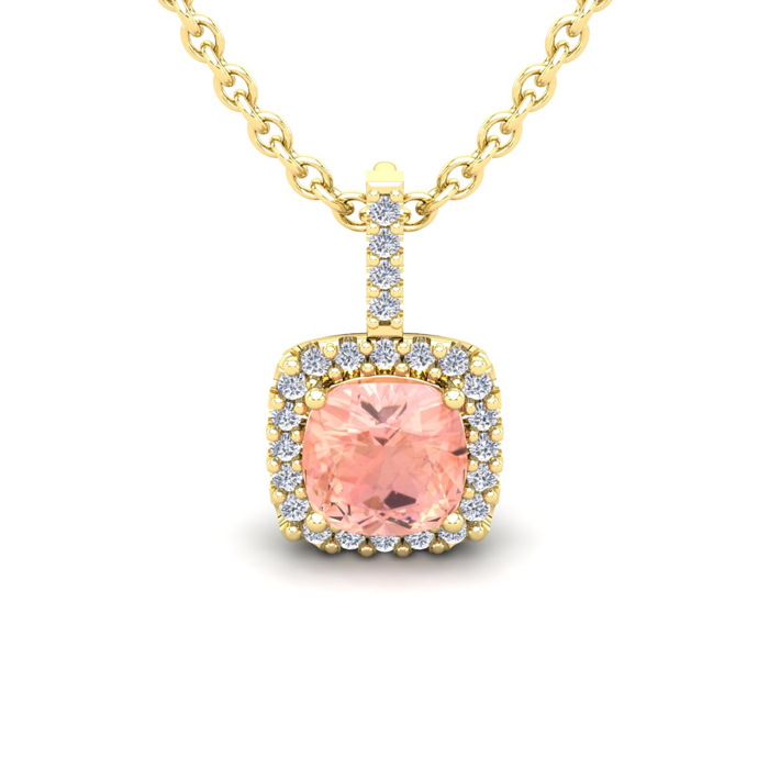 1 Carat Cushion Shape Morganite Necklace with Diamond Halo In 14 Karat Yellow Gold With 18 Inch Chain