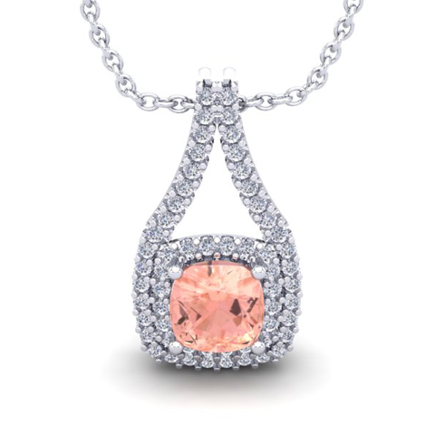 2-1/4 Carat Cushion Shape Morganite Necklace and Double Diamond Halo In 14 Karat White Gold With 18 Inch Chain