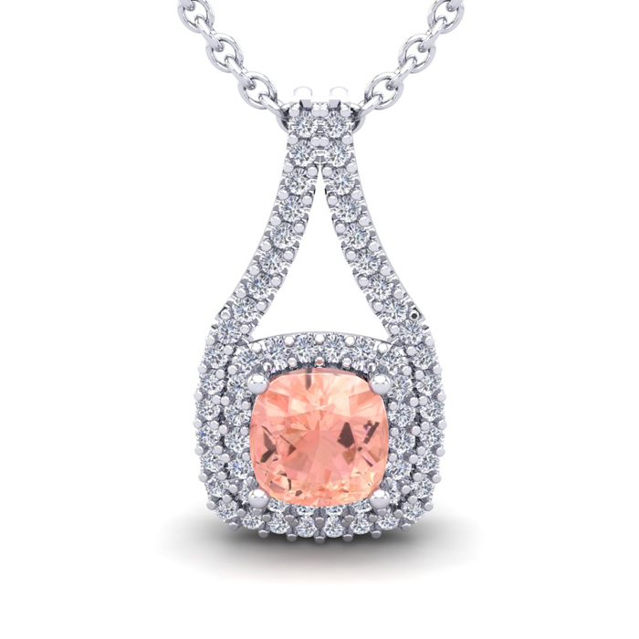 2-1/4 Carat Cushion Shape Morganite Necklace and Double Diamond Halo In 14 Karat White Gold With 18 Inch Chain