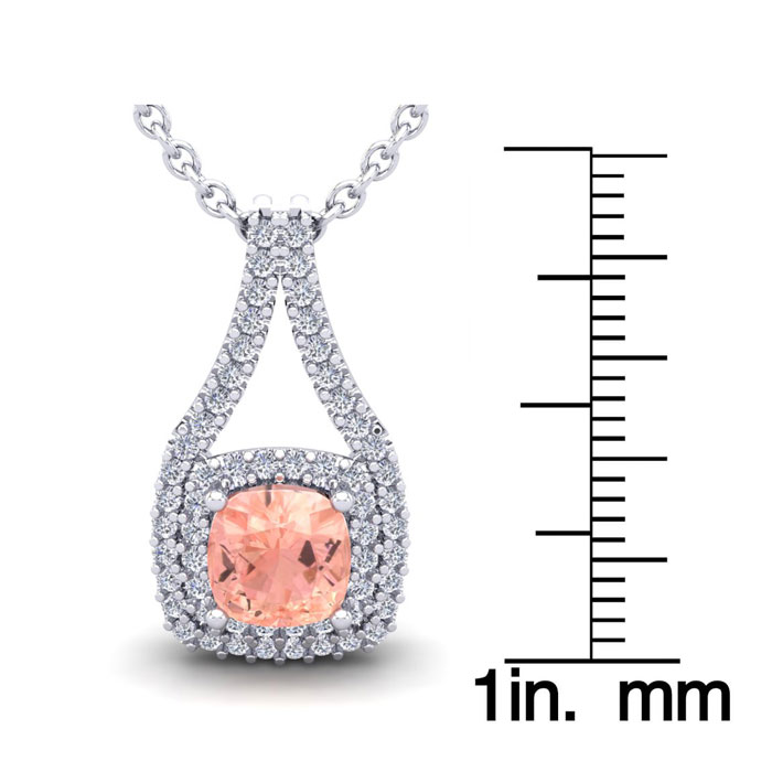 This morganite necklace features one 7x7mm cushion shape morganite gemstone at 1-2/3 carats. It is surrounded by 58 sparkling diamonds in a halo in I-J color, SI2-I1 clarity at 1/2 carats. Total gem weight is approximately 2-1/4 carats. This necklace is crafted in 14 karat white gold and comes with an 18 inch cable chain with spring-ring clasp.