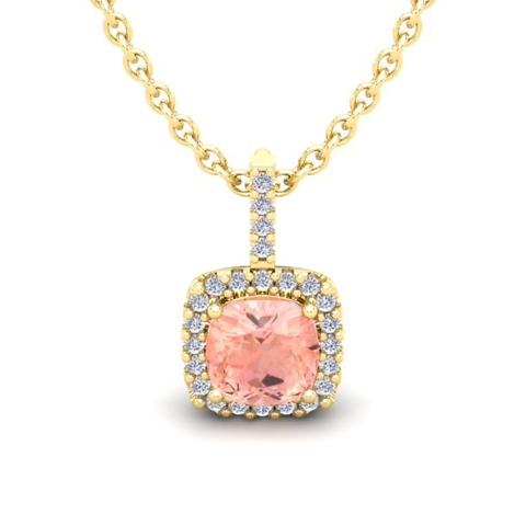 This morganite necklace features one 8x8mm cushion shape morganite gemstone at 3-1/10 carats. It is surrounded by 24 sparkling diamonds in a halo in I-J color, SI2-I1 clarity at 1/3 carats. Total gem weight is approximately 3-1/2 carats. This necklace is crafted in 14 karat yellow gold and comes with an 18 inch cable chain with spring-ring clasp.