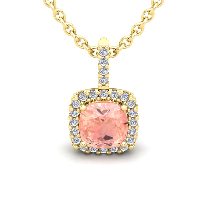 This morganite necklace features one 8x8mm cushion shape morganite gemstone at 3-1/10 carats. It is surrounded by 24 sparkling diamonds in a halo in I-J color, SI2-I1 clarity at 1/3 carats. Total gem weight is approximately 3-1/2 carats. This necklace is crafted in 14 karat yellow gold and comes with an 18 inch cable chain with spring-ring clasp.