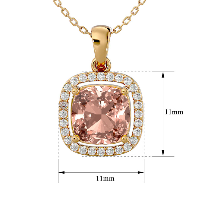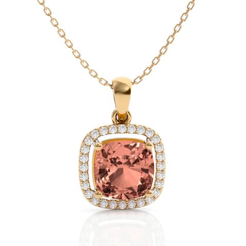3-1/4 Carat Cushion Shape Morganite With Diamond Halo In 14 Karat Yellow Gold With 18 Inch Chain