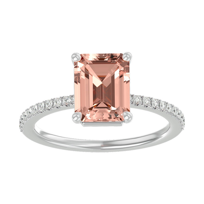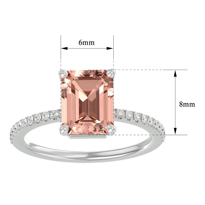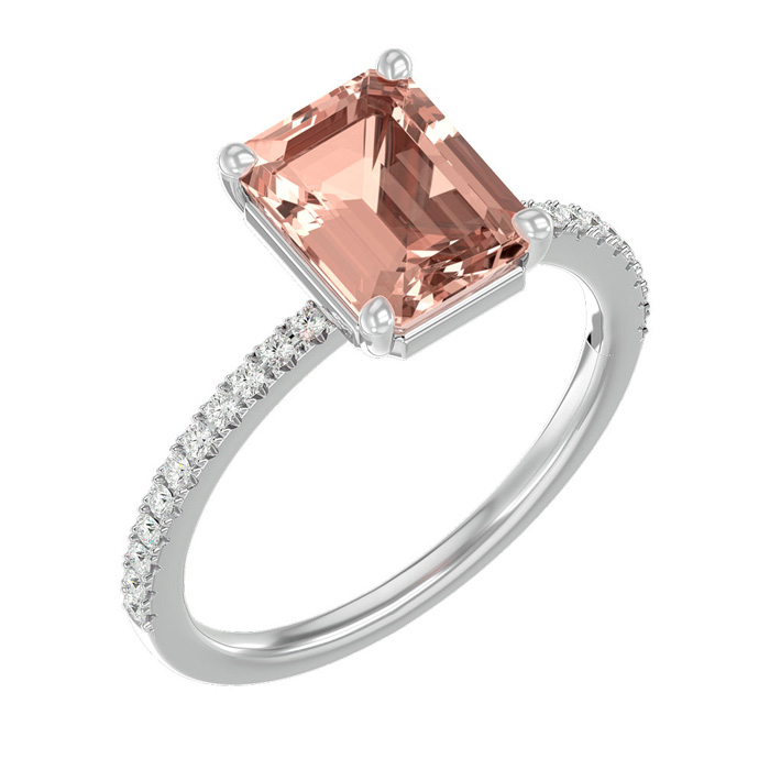 This morganite ring features one 8x6mm emerald shape morganite gemstone at 1-1/3 carats. It is surrounded by 22 sparkling diamonds along the band in I-J color, I1-I2 clarity at 1/5 carats. Total gem weight is 1-1/2 carats. This ring is crafted in 14 karat white gold.